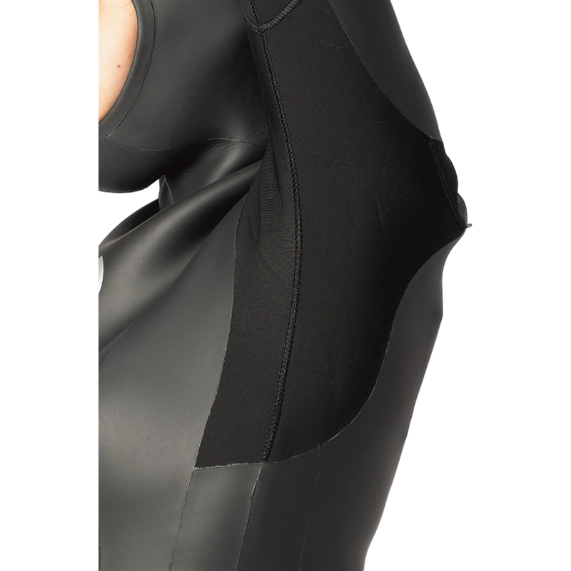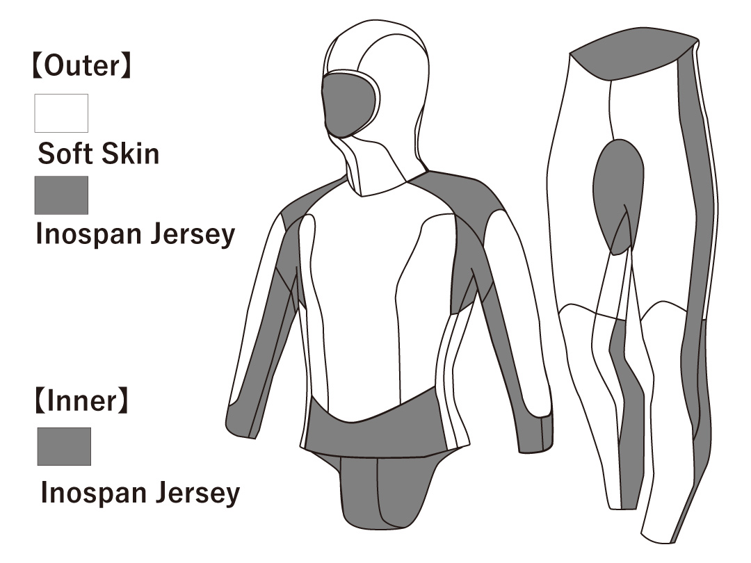 Softskin is a material that is highly waterproof, windproof, and effective in keeping you warm both in the water and on land. In addition, its high elasticity makes it easy to put on and take off. The side gussets and shoulders are made of Innospun jersey, which is five times more stretchable than normal, for ease of movement.